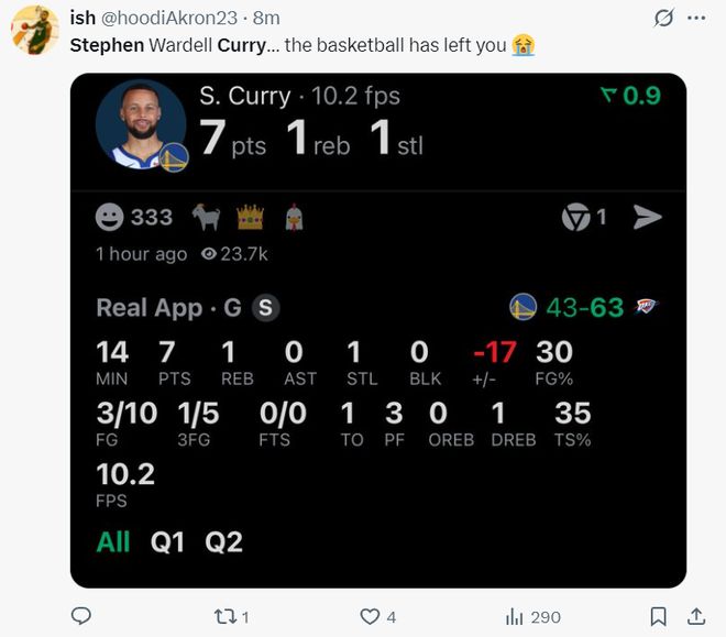 上半場庫里14分鐘,10中3,三分5中1,拿到7分1籃板1搶斷1失誤0助攻3犯規,命中率30%,三分命中率20%,真實命中率35%。美球迷:斯蒂芬,籃球似乎已經離你而去了。